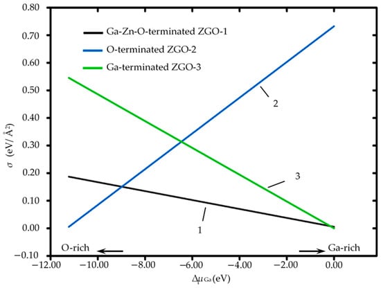 Comparison of Ga-Zn-O-terminated, O-terminated, and Ga-terminated ZnGa2O4(111) surface energies as a function of , where represents the chemical potential difference relative to metallic gallium (Ga bulk) and is defined as = − .