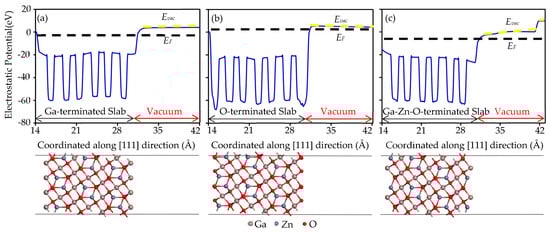where Eslab is the total energy of the vacuum-terminated slab, represents the number of atoms, denotes their chemical potentials, and A is the surface area. The work function (S) was determined by the difference between the vacuum energy level (EVAC) and the Fermi energy (EF) of the ZnGa2O4(111) slab: