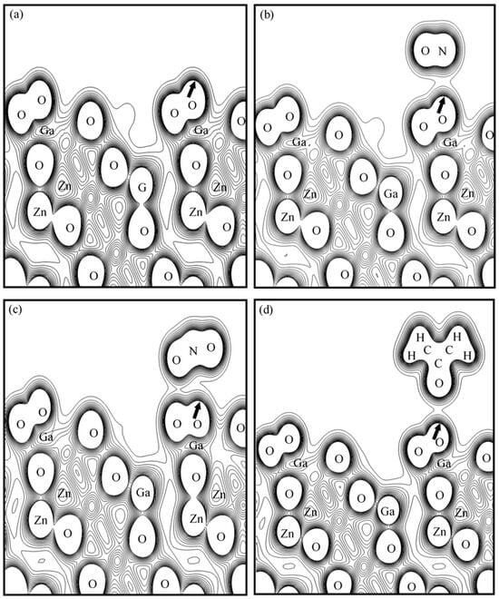 The charge density maps of O-terminated ZnGa2O4(111) before and after gas adsorption: (a) O-terminated ZnGa2O4(111) surface with an initial electron density of 0.432 electrons/Å3, featuring 15 contour levels with an interval of 0.027 electrons/Å3; (b) NO adsorption resulting in an electron density of 0.448 electrons/Å3, with 15 contour levels at an interval of 0.028 electrons/Å3; (c) NO2 adsorption resulting in an electron density of 0.435 electrons/Å3, featuring 14 contour levels with an interval of 0.029 electrons/Å3; and (d) CH3COCH3 adsorption resulting in an electron density of 0.480 electrons/Å3, with 15 contour levels at an interval of 0.030 electrons/Å3. The changes in electron density indicate varying degrees of charge transfer during the adsorption process, with NO and CH3COCH3 showing significant interactions compared to NO2. The arrows indicate the position on the ZnGa2O4(111) surface where the electron density is highest, representing regions of strong electronic interaction and potential adsorption activity.