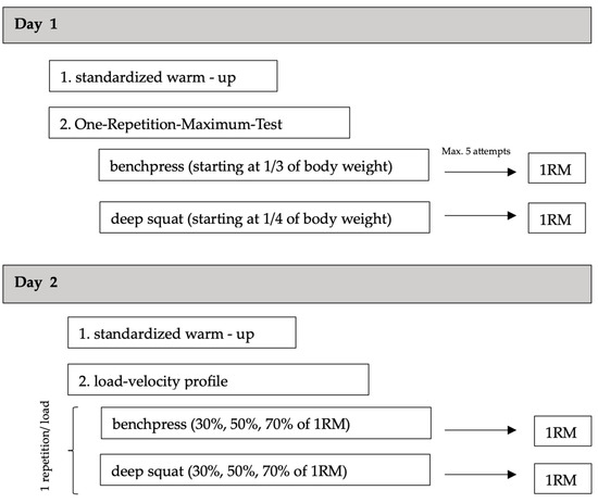 The participants visited the lab twice, with a wash-out period of at least three days and a maximum of seven days. On both testing days, the participants performed a standardized warm-up protocol, performing light jogging for approximately 5 min with perceived exhaustion of between 6 and 8 on a scale ranging from 0 to 14 (adjusted BORG scale) [35]. The first testing session was used to introduce the participants to the testing procedure and to determine the dynamic maximum strength via the 1RM in the bench press and deep squat. The results were used to determine the loads used on the second testing day to assess the load–velocity relationship. Based on the results from Soriano et al. [36], Spitz et al. [12] and Martinez-Cava et al. [32], we used 30%, 50% and 70% of the 1RM. Detailed testing information is provided in the following sections. Figure 1 provides an overview of the experimental protocol.