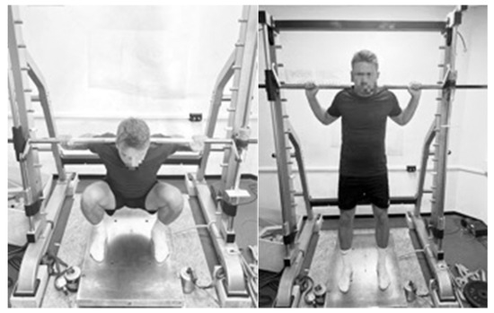 For the deep squat measurement, the participants stood upright on the force plate in a self-selected foot position, with an 11.5 kg barbell positioned on the ascending trapezius muscle (see Figure 3). The required depth was achieved when the hips were below knee level, so that the thighs moved beyond parallel to the floor and the thigh touched the calf. Correct movement execution was ensured by two investigators independently supervising the squat. Furthermore, a butt wink and knee or ankle values were not permitted. Squat attempts were considered unsuccessful if the participant could not stabilize the bar with their back, lost the bar or did not reach the required depth. The participants were accompanied by a spotter. As a maximum, two trials were allowed.