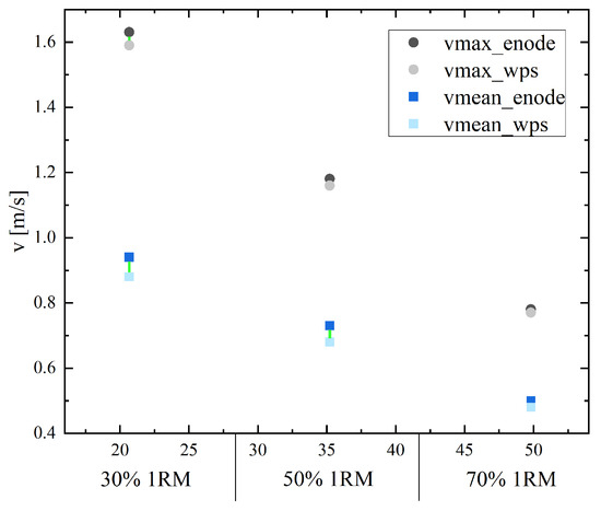Figure 6 presents the maximum and mean velocities for the load at 30%, 50% and 70% of the 1RM from both sensors during the deep squat measurement. The connecting line between the points classifies the MAPE.