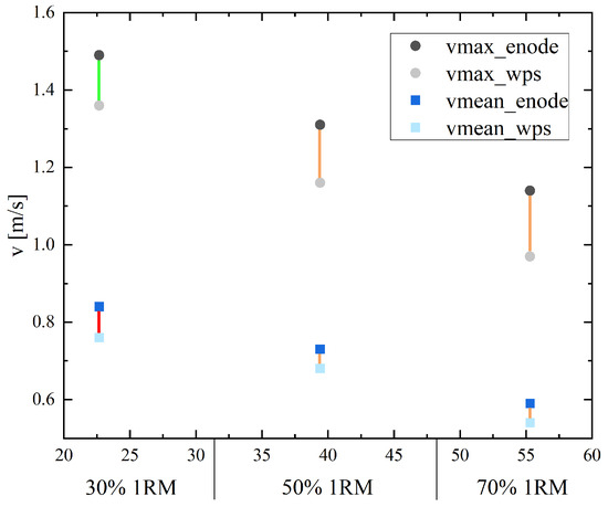 Maximum and mean velocities for the load at 30%, 50% and 70% of the 1RM for both sensors (the EnodePro and the WPS displacement sensor) during the squat measurement. The connecting line represents the size of the MAPE: MAPE < 10% green line, MAPE 10–20% orange line, MAPE > 20% red line.