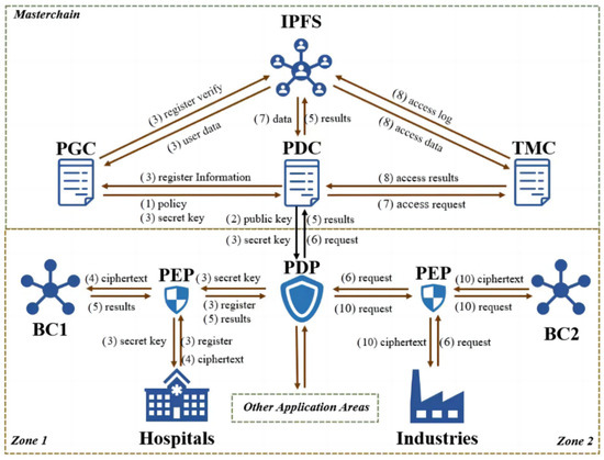 BC: The BC is an auxiliary storage chain in different application domains, primarily used for storing data on subjects’ information. With the assistance of multiple auxiliary chains, it effectively enhances the access control system’s efficiency while reducing the main chain’s load and providing storage isolation. By isolating data storage based on application domains, the BC ensures that sensitive data are encrypted and categorized using inner-product encryption before being stored, providing an additional layer of security.