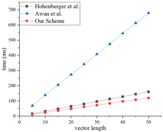 This research averaged the results of 20 experiments to obtain the final experimental data. As shown in Figure 4 and Figure 5, the registered inner-product encryption scheme proposed in this paper has slightly higher time consumption for encryption and decryption than Hohenberger’s registered attribute encryption scheme [50]. This is because inner-product encryption inherently consumes more time than attribute encryption. However, attribute encryption carries a risk of attribute disclosure, so the additional time consumed is considered worthwhile for enhanced security. Compared to Awan’s traditional encryption scheme [31], the registered inner-product encryption scheme still has considerable efficiency advantages.