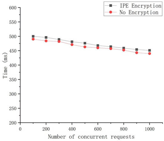 To evaluate the impact of encryption overhead on system performance, we utilized Hyperledger Fabric (version 2.4.4) as the underlying blockchain platform and employed a Kafka cluster to enhance the sequential processing capacity of transactions. For the measurement of system throughput, Hyperledger Caliper was used as the performance testing tool. We compared the throughput of the system with and without IPE under varying levels of concurrent requests. The results, presented in Figure 7, demonstrate that the system maintains high throughput in both scenarios, with only a slight reduction in performance due to encryption.