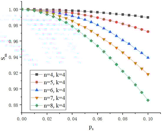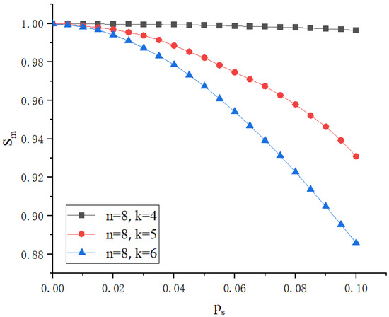 Figure 8 and Figure 9 illustrate the security of the proposed scheme in protecting identity information under different parameter conditions, where n represents the total number of generated shares, k represents the minimum number of shares required to reconstruct the secret, represents the probability of an adversary obtaining a single share, and represents the probability of successfully defending against the adversary. Figure 8 shows the impact of different total shares n on system security with a fixed threshold . It can be observed that, as increases, gradually decreases. Additionally, as n increases, even with the same , the system’s security improves because the adversary needs more shares to reach the threshold k. Figure 9 displays how changing the value of k affects system security with a fixed . As the k value increases, meaning more shares are needed to reconstruct the identity credentials, the difficulty for the adversary to succeed increases, thereby increasing the value. This indicates that higher k values can more effectively enhance the system’s security.