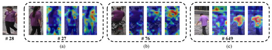 GradCAM [79] visualization of several visually similar IDs selected from the Market1501 [60] dataset. In groups (a–c), the activation maps are computed with the images of ID #27, #76, and #649 under ID #28, respectively, which reflects the Re-ID model’s capability of capturing correlations among IDs. From left to right, each group contains the original image and the activation maps of the baseline model, the instance-wise condition-guided model, and our correlation-aware-condition-guided model, respectively.