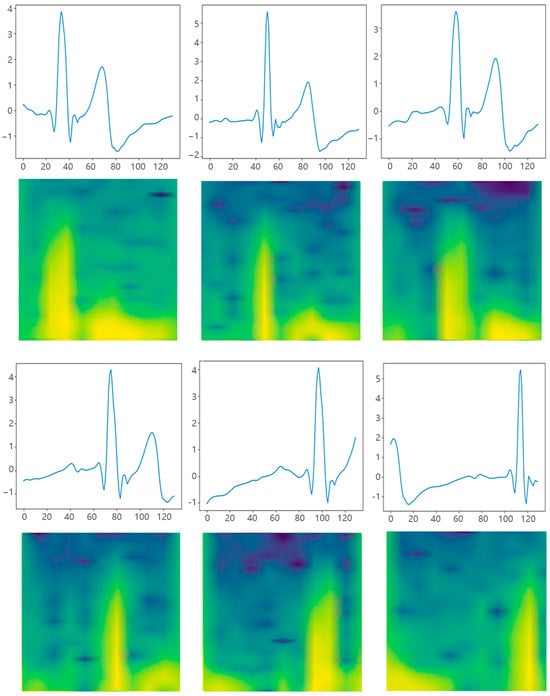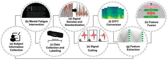 By incorporating time–frequency domain features extracted from ECG signals into DNNs, it is believed that the utilization of signal features can be optimized. Time frequency domain conversion of ECG signals usually use short-time Fourier transform (STFT) or wavelet transform to create a two-dimensional (2D) spectrogram. In heart-disease-related fields, 2D spectrograms are used as input for U-Net, enhancing model accuracy by incorporating both global and local information compared to simple 1D time series data features []. Two-dimensional spectrograms are also used in Convolutional Neural Networks (CNNs) with a parameter sharing mechanism that reduces the number of network parameters and model complexity []. Additionally, 2D spectrograms are used in a transformer network that integrates the features of the Multi-head Self-attention mechanism and Position Encoding, improving model understanding and classification accuracy of complex ECG patterns, as well as training speed and efficiency []. To the best of our knowledge, existing research has primarily focused on applications in heart disease, with few studies exploring the use of ECG spectrograms for mental fatigue classification.