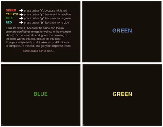 - Jostmann, N.B.; Koole, S.L. On the regulation of cognitive control: Action orientation moderates the impact of high demands in stroop interference tasks. J. Exp. Psychol. Gen. 2007, 136, 593. [Google Scholar] [CrossRef] [PubMed]