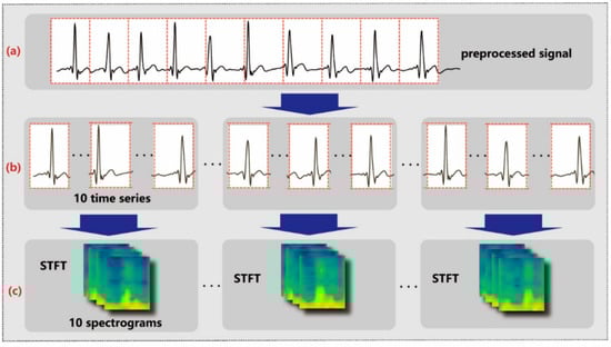Data preprocessing. The denoised ECG signal (a) is segmented into 1D time series (b) and converted into 2D spectrograms (c).