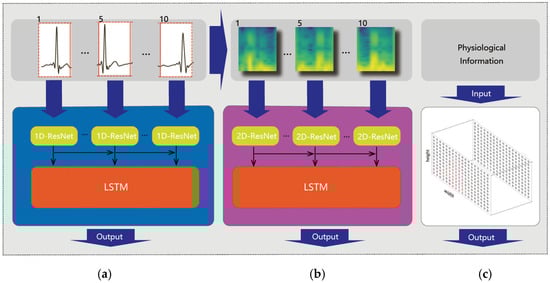 With the development of deep learning, existing research for ECG signal analysis has gradually shifted to using deep neural networks (DNNs) [,,], especially in heart disease []. Deep Belief Net (DBN) exhibits certain advantages in identifying atrial fibrillation []; however, it requires a considerable amount of time to process long sequence data. As a representative of timing analysis algorithms, Long Short-Term Memory (LSTM) outperforms DBN in distinguishing ECG morphological differences and understanding context []. Then, a DNN is proposed for automatically extracting features of ECG signals [], allowing for parallel processing of multiple signal samples and enhancing processing efficiency. Furthermore, Global Regression Neural Network (GRNN) improves the model’s classification performance in heart disease by boosting its generalization ability []. Simultaneously, research on mental fatigue has begun to incorporate deep learning methods as well. Deep Sparse Auto-encoding Network (DSAEN) exhibits advantages in processing incomplete and inaccurate signal data by combining with a SoftMax classifier []. A deep spatiotemporal convolutional bidirectional LSTM network is employed to analyze Force Feedback Glove (FFG) signals in the study of pilot’s mental fatigue, achieving an accuracy of 87% on the fatigue classification task []. Comparatively, deep learning models typically analyze the complete original signal directly, reducing reliance on manual feature extraction for processing complex data features and mitigating errors caused by human factors [,], thereby being more robust to anomalies in the data.