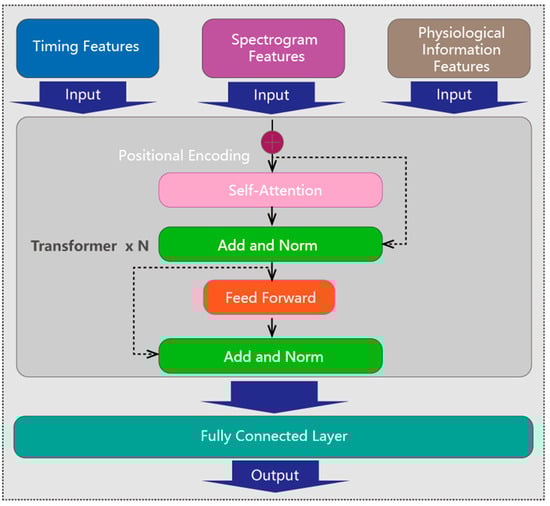 Feature fusion: The three extraction features are fed into a transformer encoder to effectively blend them together, as shown in Figure 5. In a basic transformer layer, the multi-head self-attention mechanism plays a crucial role by calculating weights to ascertain the importance of different inputs and capture their meaningful dependencies. The fused features then undergo further transformation through a feed forward module. After passing through multiple layers of the transformer encoder, the features are ultimately linearly transformed and mapped by a fully connected layer to obtain the mental fatigue state. This fusion of diverse features enables a comprehensive understanding of the ECG signal data, images features, and physiological information, leading to more accurate fatigue detection.