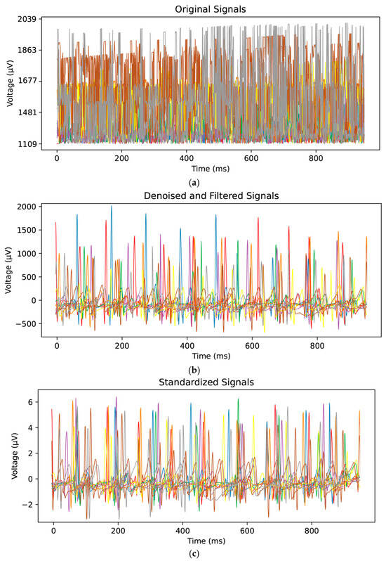 The collected ECG signals were denoised, as illustrated in Figure 6a,b. The Dobesi wavelet-5 segmentation algorithm was adopted for denoising due to its effectiveness in eliminating noise while retaining important signal information. Additionally, the DC component in the signal was removed. Subsequently, the signals were standardized, as shown in Figure 6b,c. Each signal was first centered by subtracting the average value of all the points and then divided by its standard deviation.