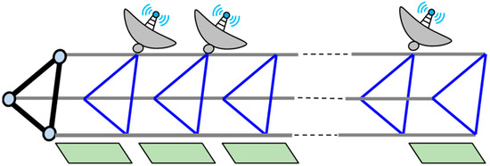 As illustrated in Figure 6, the structure comprises two components: the primary space truss framework and attached solar panels. Additional elements, such as CubeSats and antenna systems, are modeled as concentrated forces applied to the truss structure for simplification. The elementary unit cell of the periodic truss adopts a triangular prism configuration, which is characterized by a cross-sectional equilateral triangle with side lengths of 1000 mm. The structural unit cell extends 1250 mm along the x-axis. ITSs consist of four truss cells, yielding a total length of 5 m. Two plates are affixed to Truss C. Each plate has dimensions of 2300 mm in length, 350 mm in width, and 30 mm in thickness. The first plate is attached to the first two spans, while the second plate is connected to the last two spans. To facilitate folding and deployment, two plates are designed to operate independently of one another.