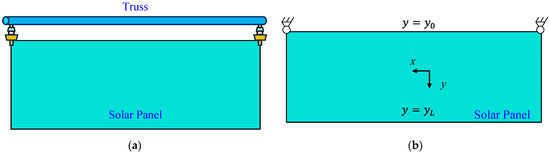 In the case of the space truss structure, three primary beams along the x direction can be regarded as cantilever beams, in which the deflection and slope at fixed left ends are nominal zero, i.e., . Hence, the deformation of the truss can be reconstructed based on Equation (6). For panel components in ITSs, as shown in Figure 3, boundary conditions deviate from classic scenarios. The panel is clamped to the edge of the space truss at only two attachment points. Deflection curves of the “two-node fixed” configuration are unconstrained within the range . Consequently, initial values required for Equation (6) cannot be determined directly.
