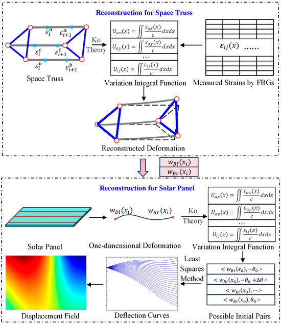 This study presents a deformation reconstruction strategy for integrated truss structures (ITSs) by integrating Ko displacement theory with the least squares optimization. The methodology is applied to an assembly consisting of a primary truss structure and solar panels with two-point fixed boundary conditions. To validate the proposed approach, comparisons between nominal and reconstructed displacements are conducted under three load scenarios: multi-point loads, uniform loads, and thermal–mechanical loads. The main conclusions are summarized as follows: