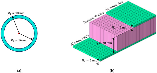 Space truss structures are fabricated from carbon-based materials with detailed material properties listed in Table 1. All beam elements in the numerical model share a consistent cross-sectional geometry where the specific profile is tubular and depicted in Figure 7. It is noted that the coefficients of thermal expansion of the three trusses are distinct. Additionally, solar panels are modeled as honeycomb sandwich plates with a honeycomb core thickness of 20 mm and aluminum skin thickness of 5 mm. Considering the thermal–mechanical load in this analysis, the reference temperature for all materials is set to 20 °C.