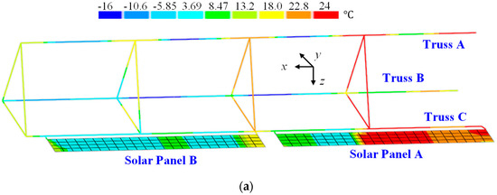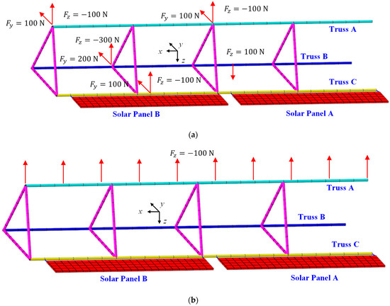 In the case of the first scenario, load cases are plotted in Figure 8. For the second scenario, the analysis incorporates thermal loads combined with multi-point mechanical loads, as depicted in Figure 9. The temperature field depicted in Figure 9a represents a typical scenario corresponding to the maximum temperature gradient experienced by ITSs. Additionally, other components undergo deformation influenced by this thermal field. The extent of deformation varies among components due to differences in their geometry and material properties. To ensure displacement continuity across different components of ITSs, internal forces arise at attachment points. These internal forces, which influence the truss structure, are represented in the model as multiple concentrated forces, as shown in Figure 9b.