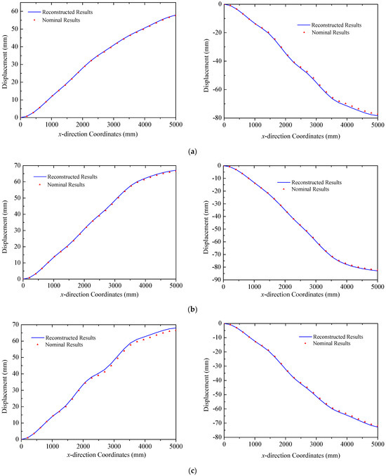 Reconstruction results of the solar panel A (thermal–mechanical loads): (a) the leading edge y = 0 mm; (b) the trailing edge y = 350 mm.