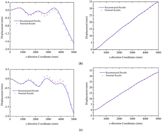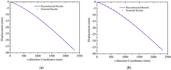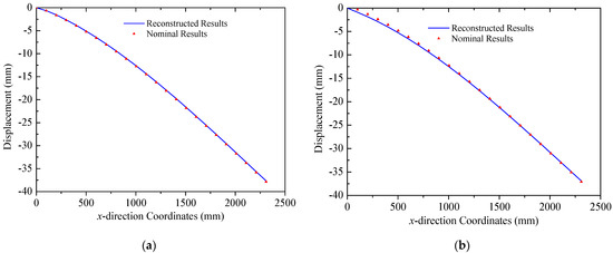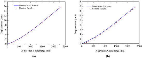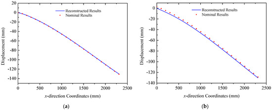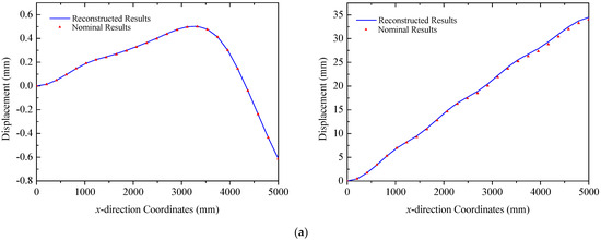 Reconstruction results of the solar panel B (uniformed loads): (a) the leading edge y = 0 mm; (b) the trailing edge y = 350 mm.