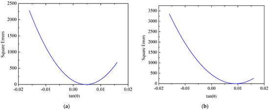 The coordinates of two mounting points of solar panel A on Truss C are = 0 mm and = 2300 mm with their respective displacements denoted as = 0 mm and = 38.45 mm. Based on the small deformation hypothesis, the optimization interval for initial values is set to [−0.16, 0.16]. Using the least squares optimization method shown in Figure 4, normal displacements at leading and trailing edges of the panel are obtained, which are illustrated in Figure 11. The errors (RMS) of the reconstructed results are 0.12 mm and 0.32 mm for the leading and trailing edges, respectively. Consequently, it can be concluded that the proposed strategy can accurately reconstruct the displacement field of panel structures with two-point fixed boundary conditions. Moreover, Figure 12 illustrates errors between reconstructed and nominal responses at the endpoint of the deflection curve as a function of during the least squares optimization process. For both leading and trailing edge cases, a unique minimum point is observed, aligning with Equation (8). For solar panel A, the optimal values of are 0.0047 and 0.0091 for leading and trailing edges, respectively. A similar trend is observed for solar panel B, which is shown in Figure 13. Errors (RMS) for this panel are 0.23 mm and 0.58 mm, respectively with the maximum error of 0.73 mm occurring at = 2500 mm on the leading edge of plate B. These results indicate that the proposed method effectively reconstructs the displacement field of flat plates at intermediate positions. The optimization process for is depicted in Figure 14, confirming the existence of unique optimal solutions. Based on the reconstructed deflections of panels A and B, the entire displacement field can be obtained by using linear interpolation, and the fields are illustrated in Figure 15.