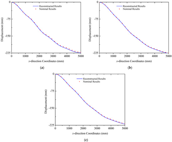 In this section, the proposed strategy is adopted to reconstruct the deformation of ITSs under combined thermal–mechanical loads, where the maximum temperature gradient in the field reaches approximately 40 °C. The deformation modes in this scenario are more complicated compared to those induced by pure mechanical loads, which is particularly evident in the displacement in the y direction. As shown in Figure 19, the primary deformation of the truss structure is dominated by the z directional component. For Truss A, the values of error (RMS) are 0.0021 mm and 0.32 mm with a maximum error of 0.53 mm. In the case of Truss B, indicators are 0.085 mm and 0.18 mm, respectively. For Truss C, errors (RMS) are less than 0.17 mm for the two figures in Figure 19c. These comparisons validate the capability of the proposed method in reconstructing deformations of triangular trusses under thermal–mechanical loads.