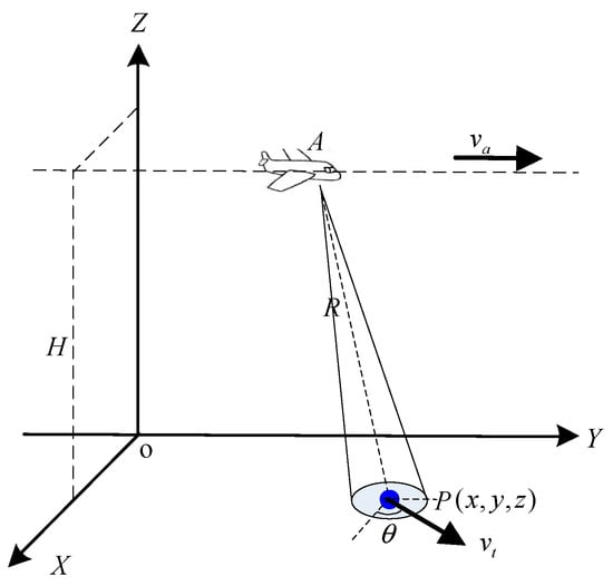 where denotes the backscattering coefficient of the target, represents the speed of light, and is the wavelength. Suppose that the backscattering coefficient of the target varies negligibly during the pulse interval . We define the radial speed of the airborne radar relative to the target as . Substituting (4) into (7), we can obtain the following: