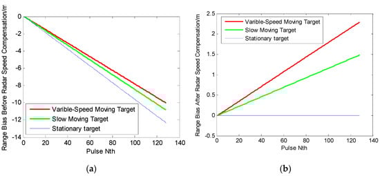 Comparison between the range bias before and after radar speed compensation: (a) range bias before radar speed compensation; and (b) range bias after radar speed compensation.