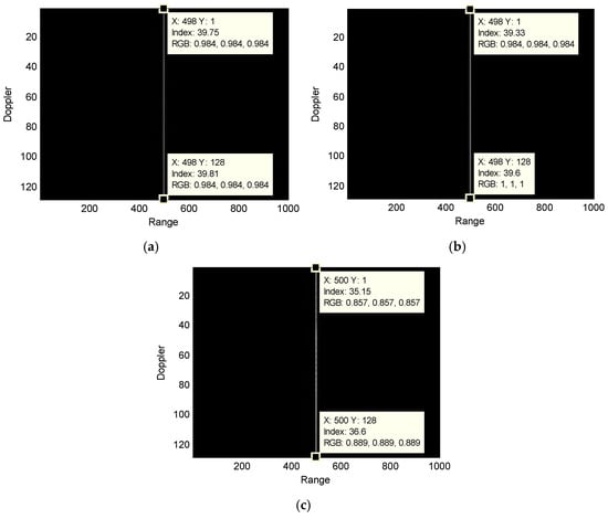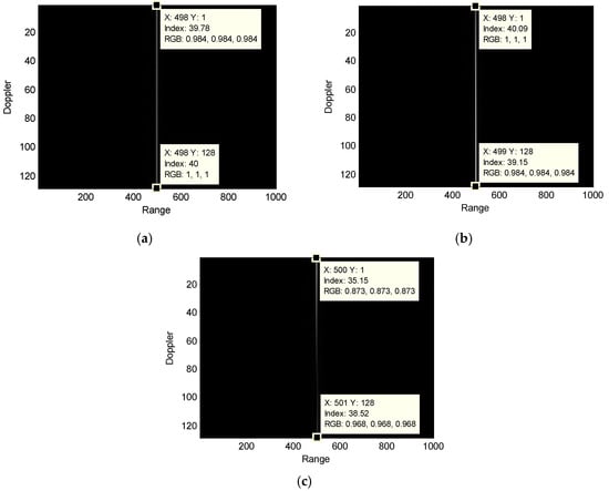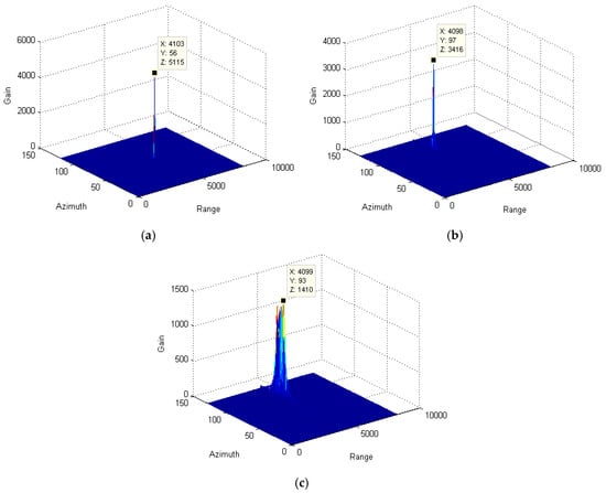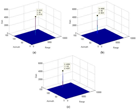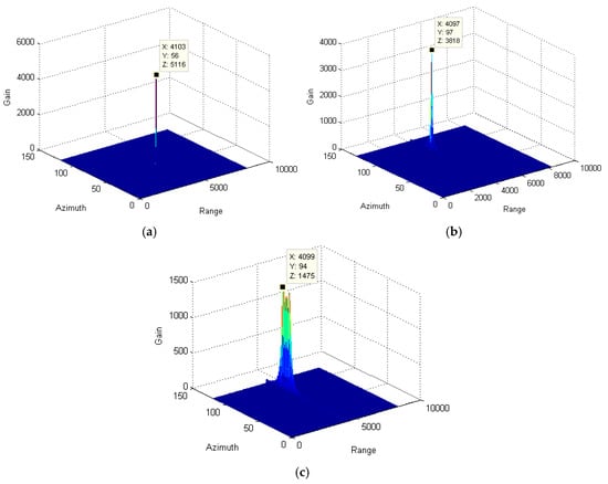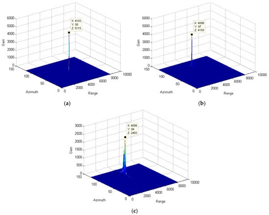 In the above formula, the residual phase part of due to the radical speed of the target will further affect the target position and signal focusing along the azimuth direction. Especially for those varying-speed targets, the residual phase part seriously decreases the signal-accumulating gain and results in signal defocusing. To effectively solve this problem, an azimuth phase filter is utilized to reduce the high-order phase error. For comparison purposes, signal-accumulating results from targets with a different moving state is presented, as shown in Figure 8. By comparing Figure 4c and Figure 8c, the signal-accumulating gains of the varying-speed target and slow-moving target are significantly improved. However, for the stationary target, since the high-order phase error can be ignored, the effectiveness of our method is limited.