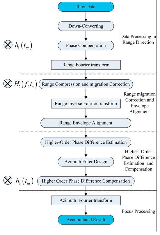 - Higher-order phase difference estimation and compensation. This step initially calculates the phase gradient between the adjacent pulses along the azimuth. Meanwhile, the higher-order phase difference is estimated through low-frequency filtering. Then, the resultant azimuth filter is utilized to compensate such a higher-order phase.