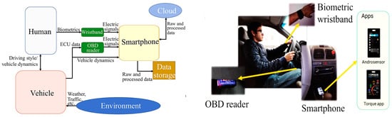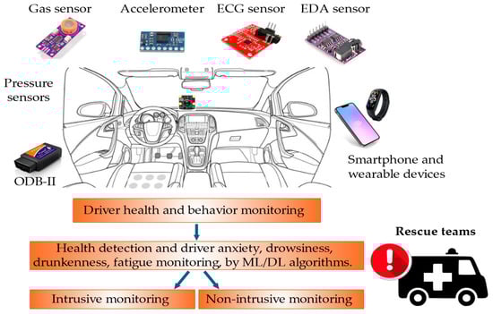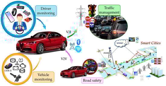 In recent years, growing urbanization and the increasing number of vehicles on the road have introduced new challenges related to transportation safety, efficiency, and sustainability, leading to growing interest in the Internet of Vehicles (IoV) []. Within this framework, the monitoring systems of driver, vehicle, and road conditions have become key components of Intelligent Transportation Systems (ITSs) and smart cities []. These systems leverage advanced technologies, including sensors, IoT devices, and Artificial Intelligence (AI) to collect, analyze, and utilize real-time data. Their objectives include optimizing traffic flows, enhancing road safety, safeguarding drivers, and reducing environmental impact (Figure 1) []. The automotive industry has recently undergone rapid advancements in driver assistance technologies, notably with the development of advanced driver assistance systems (ADASs) [,]. These systems represent a crucial step toward future mobility []. However, addressing road safety, transportation efficiency, sustainability, and increasingly complex driving conditions requires innovative solutions, particularly to ensure the safety of all road users []. In this regard, Driver Monitoring Systems (DMSs) are gaining prominence for their ability to detect health anomalies, drowsiness, intoxication, and unsafe driving behaviors []. Recent studies indicate that human errors account for approximately 90% of road accidents, many of which could be prevented with effective monitoring systems [,]. These systems rely on both intrusive and non-intrusive sensors to monitor drivers’ biophysical parameters (such as Electrocardiograms (ECGs), photoplethysmography (PPG), Electrodermal Activity (EDA), heart rate (HR), Blood Alcohol Concentration (BAC), respiratory rate (RR), and oxygen saturation (SpO2)) and cameras to detect facial cues like yawning, blink rate, and head movements. Using Machine Learning (ML) algorithms and real-time data analysis, these systems enable timely interventions, preventing accidents and saving lives [,,,,]. Research has also addressed the recurring tragedy of infants being accidentally left in vehicles. Innovative systems now exist that can detect an infant’s cries and send alert signals through mobile applications, prompting immediate action [,]. Investing in such technologies enhances road safety and fosters a more responsible and conscientious driving environment.
