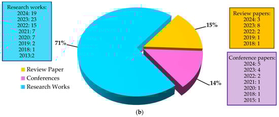 To provide an accurate analysis of the topics covered in this manuscript (i.e., on-board systems for driver and vehicle monitoring, and off-board systems for traffic and road management and monitoring), the authors have reviewed 119 documents, including research articles, conference papers, review articles, and websites. The primary sources for these articles were Elsevier, MDPI, and IEEE. In Figure 3a, the selected articles are categorized by publisher, while in Figure 3b, they are sorted by type.