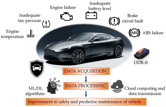In recent years, vehicle safety has become a priority in the automotive industry, leading vehicle manufacturers to develop and implement advanced technologies for monitoring and enhancing road safety. These systems protect vehicle occupants while improving interaction with the surrounding environment. One key safety feature is the Tire Pressure Monitoring System (TPMS) [], which alerts drivers to under- or over-inflated tires, improving vehicle safety. Additionally, sophisticated systems can assess road conditions in real time, detecting hazards such as potholes, ice, or other surface irregularities. Driver-assistance technologies, including stability and braking control, employ sensors and cameras to continuously monitor vehicle performance and the surrounding environment, and automatically intervene in critical situations, providing a more controlled and safer driving experience. These advancements are often integrated into broader smart mobility strategies, where connectivity and data collection are crucial for improving road safety and minimizing accident risks. Such innovations contribute to a safer, more informed, and more responsible driving experience. A comprehensive vehicle monitoring model relies on engine and battery health data, tire pressure and wear, and oil and coolant temperatures, all collected via the on-board diagnostics (OBD-II) system and then processed by ML algorithms to assess the vehicle safety level, as illustrated in Figure 11. Furthermore, this information allows predictive maintenance to guarantee optimal vehicle performance and efficiency.
