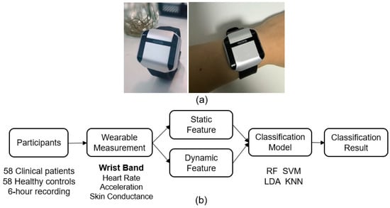 (a) The wristband device; (b) the flowchart of data analysis. The classification models include Random Forest (RF), Support Vector Machine (SVM), K-Nearest Neighbors (KNN), and Linear Discriminant Analysis (LDA).