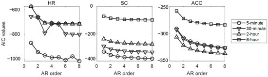 The overall AIC criterion of all participants across AR models with different indexes. Three subplots, respectively, represented the AIC in AR models based on HR, SC, and ACC signals.