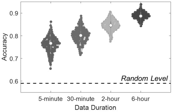 To further explore the model stability with shorter data lengths for better clinical applications, we explored the classification models on data aggregated over 6 h, 2 h, 30 min, and 5 min segments, respectively. For the latter three conditions, segments of 2 h, 30 min, and 5 min were randomly selected from the 6 h recording data of each participant in order to avoid potential biases that might be introduced by selecting specific moments. The randomized selections were conducted 1000 times to obtain a distribution of accuracies. We performed feature extraction on all the time segments, including the calculation of both the static and dynamic features. The participants without valid data segments for a specific data duration were excluded from the corresponding classification analysis. For instance, if one participant did not have a valid 2 h data segment after the missing data operation, this participant was excluded from the 2 h classification; however, the same participant may be included for the 5 min classification if he or she had valid 5 min segments.