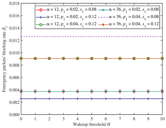 As shown in Figure 5 and Figure 6, when the wakeup threshold H and adjustment factor change, emergency packets’ blocking rate and throughput remain unchanged. This is because the wakeup threshold and dynamic access probability control the access and forwarding process for only non−emergency packets, and the system behaviour of non−emergency packets cannot affect emergency packets, which have preemptive priority. It also indicates that the proposed mixed mechanism can ensure the comprehensive forwarding performance of emergency packets.
