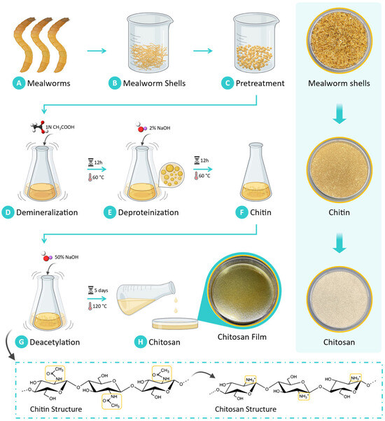 The sequential steps involved in extracting chitosan from mealworm shells. (A) Mealworms cartoon depiction. (B) Mealworm shells are obtained. (C) These flakes are finely pulverized into a powder form during pretreatment. (D) The purification process begins with demineralization, wherein the powder is dissolved in acetic acid solution to remove minerals present in the biomass. (E) Deproteinization is carried out using an alkali digestion method, wherein a sodium hydroxide solution is employed to remove protein content from the material. The proteins are associated with the chitin structure through glycosidic bonds. (F) This step isolates chitin as the primary product. (G) Chitosan is then derived from chitin via a deacetylation process, which involves treating chitin with a concentrated sodium hydroxide solution. During this reaction, the N-acetyl groups within the chitin are transformed into amino groups, yielding chitosan. (H) The resulting chitosan is subsequently cast onto a petri dish for further use. Digital photos of the resulting chitosan film are shown above along with the obtained mealworm shells (biomass), the extracted chitin, and the synthesized chitosan (far right).