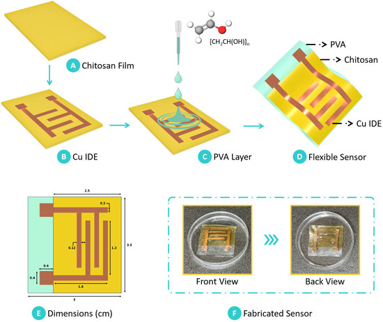 The mixture was stirred for two hours at 60 °C to ensure complete dissolution, resulting in a homogeneous PVA solution. This PVA solution was then carefully drop-cast onto the chitosan film layered with the copper IDE, creating a laminate composite structure. DMSO was selected due to its high solvency for PVA, which ensured a homogeneous and consistent solution. While water and ethanol were considered as potential solvents, they did not achieve the required solubility, which is crucial for uniform film formation. The use of DMSO contributed to the fabrication of high-quality films with optimal performance characteristics. The addition of PVA provided a substrate layer that enhanced the structural stability of the chitosan–copper assembly while retaining flexibility. The resulting multilayer structure comprised the chitosan film as the sensing layer, copper electrodes as the conductive element, and PVA as a stabilizing substrate. This composite design facilitated high sensitivity and robustness in detecting humidity changes. Figure 2 provides a schematic representation of the fabrication process, detailing each stage in the assembly of the biomass-derived chitosan-based humidity sensor.