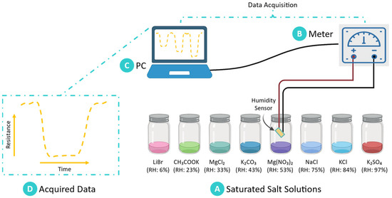 An experimental setup was meticulously designed to ensure stable and accurate RH conditions for sensor testing, as illustrated in Figure 3. The setup consisted of sealed containers housing saturated salt solutions, which allowed us to maintain constant humidity levels around the sensor. To mitigate fluctuations caused by temperature variations, a water bath was integrated into the system, maintaining a constant temperature of 25 °C throughout the testing period. This temperature regulation was essential for ensuring the consistency and reliability of RH readings. During each test, the dynamic response of the chitosan-based sensor to varying RH levels was systematically recorded. Resistance changes in the sensor were monitored at consistent intervals to capture its responsiveness across the full range of RH conditions. A Keithley source meter was employed to measure the sensor’s electrical response, applying a constant voltage of 1 V DC. The conductance of the sensor was carefully recorded for each RH level. This methodology facilitated precise assessment of the sensor’s sensitivity, stability, and responsiveness under controlled conditions.