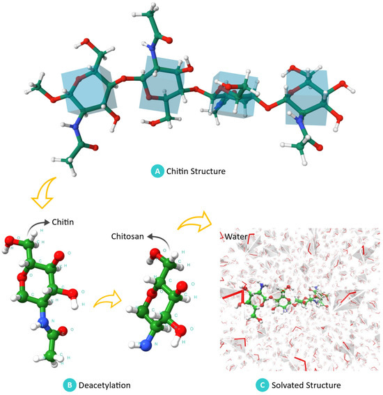 The interaction between chitosan and water molecules was investigated through molecular simulations to gain insight into the structural behavior of chitosan in aqueous environments. Molecular dynamics (MD) simulations were conducted using the Large-scale Atomic/Molecular Massively Parallel Simulator (LAMMPS) package [26], a powerful tool for modeling complex molecular systems. The simulations were run on a PC equipped with an AMD Ryzen 5 5600 6-core processor (AMD, Addison, TX, USA) operating at 3.50 GHz. Initially, the molecular modeling of the chitin structure was carried out using the Carbohydrate Builder of GlyCam [27], an online tool specialized in carbohydrate modeling. This process generated a chitin structure composed of four units of β-1,4-linked N-acetylglucosamine, as depicted in Figure 4A. Subsequently, the chitin structure was chemically modified to obtain the chitosan structure by removing the acetyl group from the molecular chain, as illustrated in Figure 4B. The deacetylation process, which converted chitin to chitosan, was achieved using PyMol software (Version 3.1, Shrodinger, New York, NY, USA) [28], ensuring a degree of deacetylation of 100%. To prepare the chitosan structure for MD simulations, solvation was performed using the CHARMM-GUI interface [29,30]. The chitosan structure was solvated with 2626 water molecules employing the TIP3P water model, with a solvation edge distance of 10 Å.