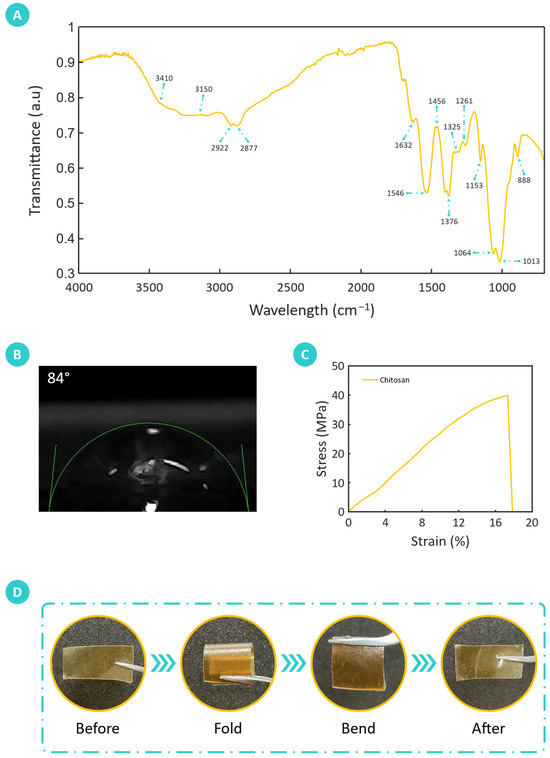 Comprehensive characterization of the fabricated chitosan film. (A) Fourier-transform infrared (FTIR) spectroscopy analysis elucidates the chemical structure and composition of the biomass-derived chitosan. (B) Contact angle measurement shows a contact angle of 84 ± 1.58°, indicating moderate wettability. (C) Stress–strain analysis demonstrates the mechanical robustness of the film, with an ultimate tensile strength (UTS) of 39.92 MPa and an elongation at break (EAB) of 17.49%, reflecting a balance of strength and flexibility. (D) Flexibility assessment of the film through deformation tests, demonstrating its ability to bend and fold without structural failure.