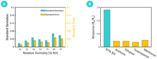 Such consistency suggests that the sensor can reliably produce stable measurements, supporting its suitability for applications that require high measurement accuracy, including environmental monitoring and industrial humidity control. Furthermore, low measurement variability minimizes uncertainty, increasing confidence in the sensor’s ability to deliver accurate and reliable humidity readings under different environmental conditions. The robustness indicated by these low SD values implies that the sensor experiences minimal performance drift or fluctuation, reinforcing its stability and making it dependable for long-term use. Figure 7B highlights the selectivity of the chitosan-based humidity sensor by displaying its responses to different volatile organic compounds (VOCs), specifically acetone, ethanol, isopropanol, and methanol, in comparison to water vapor. The bar chart reveals that the sensor demonstrates a markedly higher sensitivity to water vapor than to these interference gases. This selective response is beneficial for humidity-sensing applications, as it suggests that the sensor can effectively distinguish water vapor from other VOCs, even in environments with potential gaseous contaminants. This distinct response profile reflects the sensor’s inherent material properties, such as the strong hydrogen bonding affinity of chitosan’s hydroxyl and amine functional groups, which favor interactions with water vapor over other VOCs.
