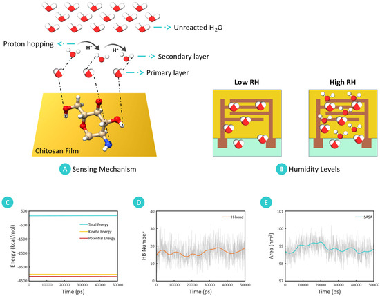 Humidity-sensing mechanism and molecular interaction in the chitosan-based humidity sensor. (A) Schematic representation of the humidity-sensing mechanism, detailing the interaction between chitosan and water molecules. The illustration highlights the primary and secondary layers of water molecule adsorption, the formation of hydrogen bonds, proton hopping, and unreacted molecules of water. (B) The impact of humidity levels on the developed chitosan-based humidity sensor. In high-humidity conditions, the sensing material interacts with a significant number of water molecules, whereas in low-humidity conditions, the interaction is minimal. (C) Presents a plot of the energy evolution during the simulated chitosan solvation process, demonstrating successful equilibration and a constant energy state throughout the simulated timesteps. (D) The plot of the quantity of hydrogen bonds formed between the structure of chitosan and the water molecules over the simulated timesteps, with an average of 17 hydrogen bonds observed. (E) The solvent-accessible surface area, with an indicated average of 99 nm2.