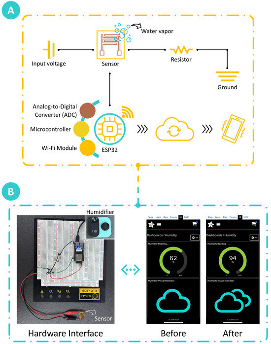 To validate the feasibility and performance of the chitosan-based humidity sensor within an Internet of Things (IoT) framework, a comprehensive system was developed to enable real-time monitoring and wireless transmission of humidity data. The setup, illustrated in Figure 9A, integrates a series of interconnected electronic components that convert the sensor’s analog output into digital signals, enabling wireless data transmission and remote display on a mobile device. The demonstration began with the provision of a stable 3.3 V power supply to the humidity sensor, ensuring consistent operation throughout the testing period. The sensor was connected in series with a resistor to monitor current variations induced by changes in the sensor’s resistance, which varied in response to fluctuations in water vapor levels. These resistance changes produced corresponding voltage variations across the resistor, creating a measurable output signal that directly reflected the relative humidity (RH) in the environment.
