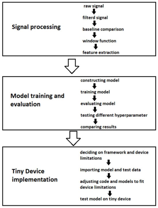 Schematization and visualization of data processing steps carried out on the measurement dataset from raw signals until the final prediction.