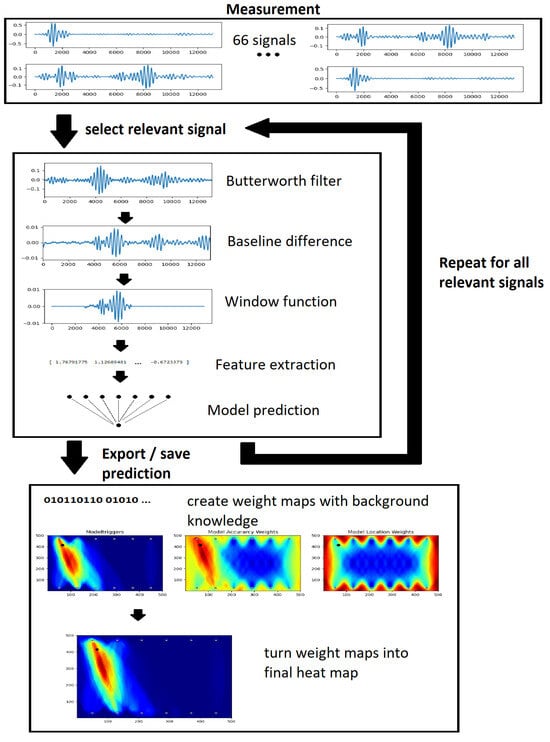 Ultimately, the goal is to take a UGW measurement dataset collected from a distributed sensor array and process it using neural networks to predict the sensor paths affected by damage and then use structural information from the system to create a heat map showing the most likely damage locations. The model predictions themselves are in binary format, but with the use of the structural knowledge of the plate and the transducers, the binary code can be turned into a heat map. The entire data processing flow can be seen in the flow chart in Figure 2. This shows the steps of the data processing that are carried out with the measurement until the final prediction. It starts with the measurement, which consists of 66 signals, from which a relevant signal subset is selected. All signals are then processed with a filter, and then the difference to the baseline is measured. The window function cuts out the pitched signal in the measurement, which is then passed on to the feature extraction. The model uses the extracted features to make a prediction for the signal. This is performed for all relevant signals. The results of the prediction can then be converted into weight maps using the structural knowledge of the covered plane and the models. These weight maps can then be used to calculate the final heat map.