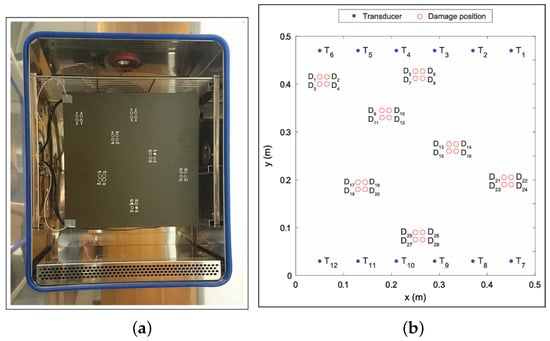 This figure shows on the left (a) the SHM plate inside of the climate chamber, with the damage locations marked with white circles, and on the right (b) the graph showing the named damage locations in the coordinate system.