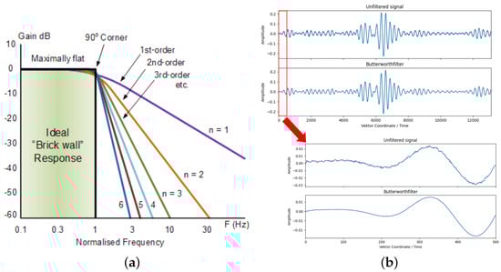 The dataset consists of the raw measurement data that are further processed with the Butterworth filter (BWF). The BWF is designed to have a frequency response that is as flat as possible in the pass band (around the signal frequency). This is why it is also referred to as the “maximally flat magnitude filter”. The maximally flat response is achieved with no pass band ripple until the cut-off frequency at −3 dB and a roll-off of −20 dB in the stop band (per decimal power). A major disadvantage of the BWF is that it achieves this pass band flatness at the expense of a wide transition band as the filter changes from the pass band to the stop band. This can be corrected by using higher orders of the BWF. Figure 4 shows the influence of the BWF to a signal. Figure 4a displays how the suppression of non-target frequencies becomes stronger with higher orders. However, higher orders also introduce an increasing time lag in the signal, suggesting to keep the order as low as possible when the frequency filtering is enough. Figure 4b shows that the first-order BWF applied to one of the signals reduces the noise strongly, which is the reason why higher orders are not deemed necessary.